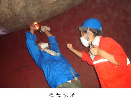 2008年8月20日至21日,济宁分院容器检验中心对山东正大菱花生物科技有限公司的4台400m3的大型发酵罐进行了全面检验,这是我院首次开展此类设备的全检工作。该类发酵罐直径6米,高19米,无论检验技术要求还是检验工作难度都非常大。检验人员根据检验方案在设备内冒着36度的高温及探伤剂刺鼻的气味对其焊缝进行渗透探伤;他们一丝不苟,不放过任何一个微小细节,通过探伤发现在发酵罐的上下封头处存在多次表面裂纹,立即指导企业对其进行了修复打磨,重新进行了探伤直至合格。由于企业停产检修时间短,为了不耽误企业的正常开工生产,检验人员同受检单位精诚协作,牺牲中午就餐和休息时间,冒着高温酷暑,加班加点工作,经过两天两夜的艰苦奋战,终于如期完成了检验任务。