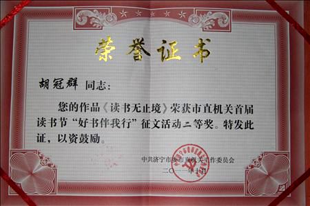 济宁分院容检中心胡冠群同志,在此次征文活动中,积极准备,踊跃投稿,以一篇《读书—无止境》最终代表我院获得征文活动二等奖。