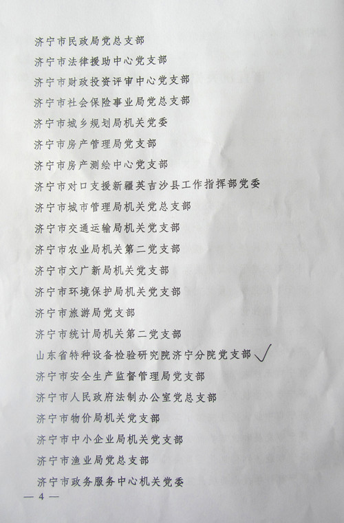 山东省特种设备检验研究院济宁分院党支部积极发挥基层党组织的创造力、凝聚力和战斗力,充分发挥共产党员的模范先锋作用,在服务中心、建设队伍,创建党建品牌等方面走在前列。于6月29日受到中共济宁市委市直机关工委表彰,被授予“市直机关先进基层党组织”荣誉称号。