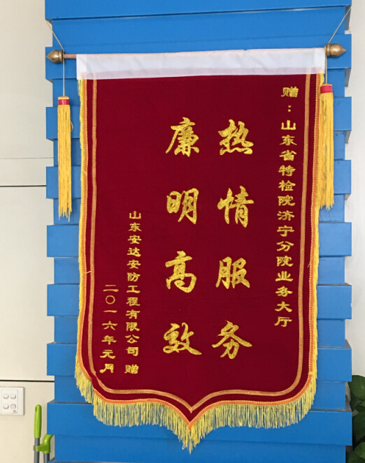 2016年1月7日,新年伊始,山东安达安防工程有限公司领导来到省特检院济宁分院业务大厅,为大厅工作人员赠送名为“热情服务、廉明高效”的锦旗,代表全市特种设备安装维保单位表达对分院业务大厅工作的肯定与感谢。