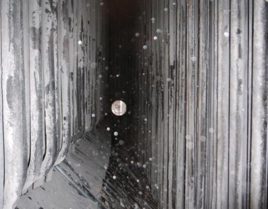 炉外部检验是对锅炉正常运行时的状况进行检验,锅炉内部检验是对停炉状态下锅炉内部状况的检验。炎炎夏日,七月入夏以来气温走高,室外温度30多度,密闭锅炉内部温度高达40度。锅炉房内一边是在运行的15吨循环流化床锅炉,炉温高达900度,热浪滚滚;另一边是高高矗立的35吨循环流化床锅炉,炉膛、尾部烟道空间密闭狭窄,遍布烟灰。