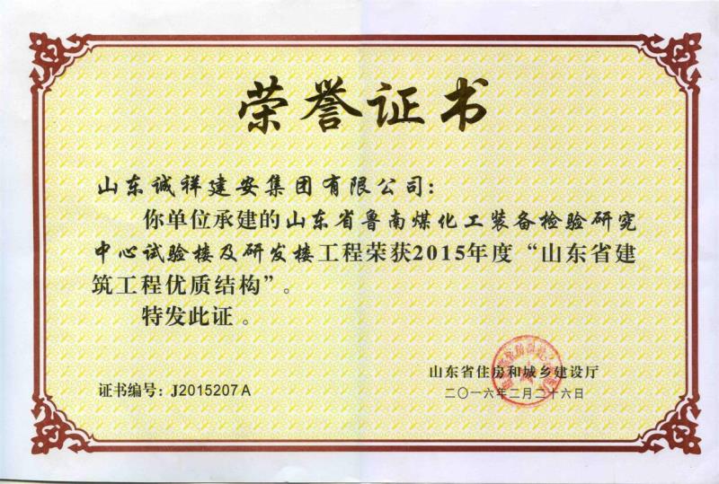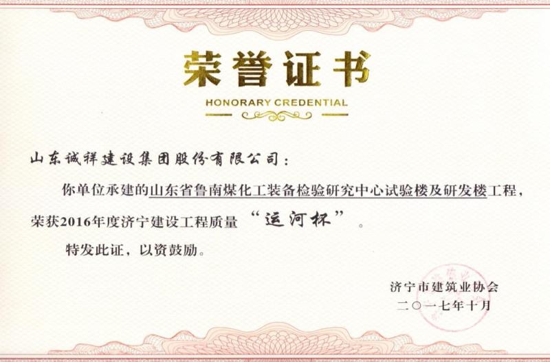 “泰山杯”奖是山东省建筑行业工程质量方面的最高荣誉奖,由山东省建设厅、山东省建筑工程管理局、山东省建筑业联合会颁发。“泰山杯”奖每年评选一次,经市地建筑行业管理部门择优推荐上报进行评选,各地市上报的奖励数额每年一般不超过7个。本年度我院“山东省鲁南煤化工装备检验研究中心试验楼及研发楼” 建设项目能从全市众多建设项目中脱颖而出,标志着项目建筑工程质量达到了国内及省内同类工程先进水平,必将成为山东质监系统建设项目里程碑式建筑。