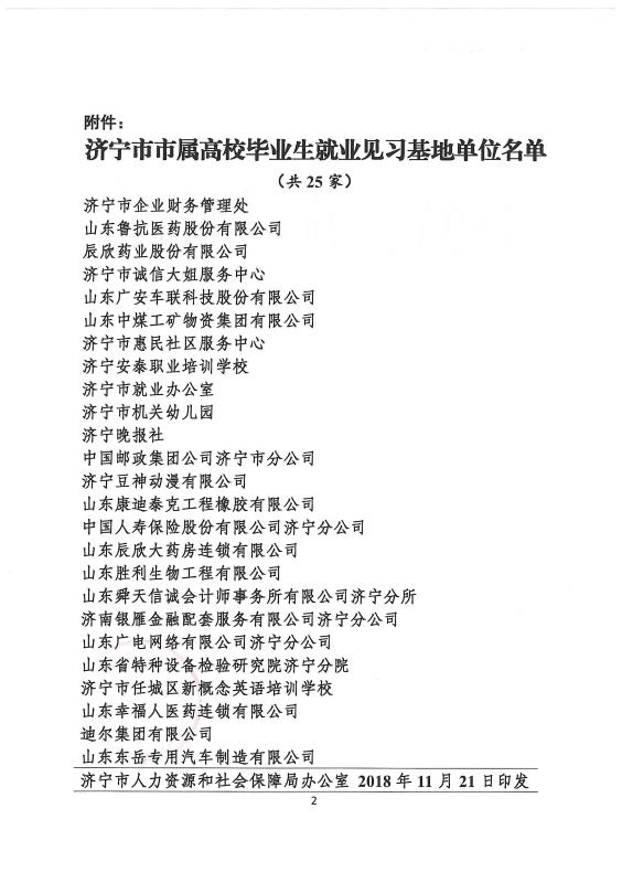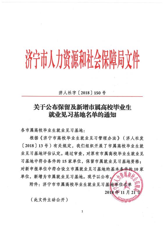 2018年11月21日,济宁市人力资源和社会保障局文件《关于公布保留及新增市属高校毕业生就业见习基地名单的通知》(济人社字[2018]150号)公布,山东省特种设备检验研究院济宁分院新增为济宁市市属高校毕业生就业见习基地。