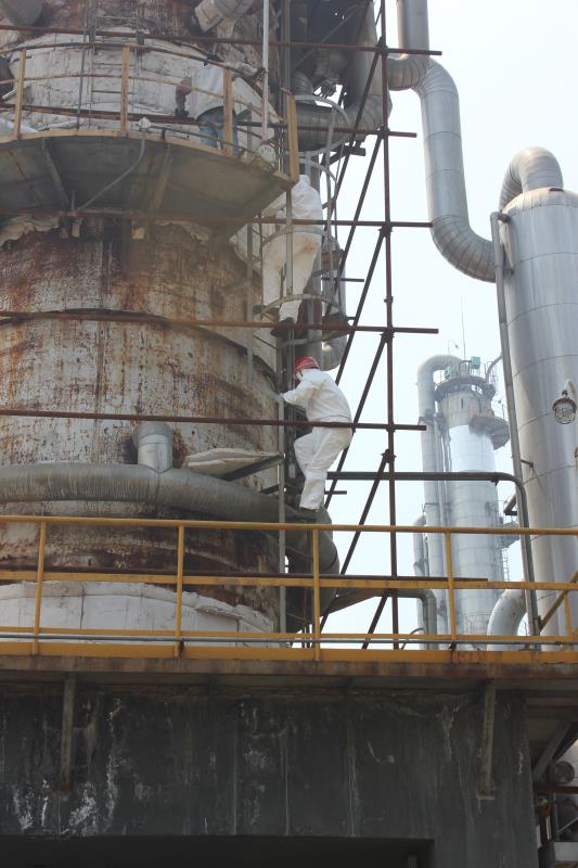他是谁?为什么将自己置身于如此险恶的环境?请允许我怀着敬意告诉您,他是山东省特种设备检验研究院济宁分院压力容器压力管道检验中心检验人员,正在对某化工企业的化工装置进行检验检测,这是每天每时每刻都会发生的普通场景。
