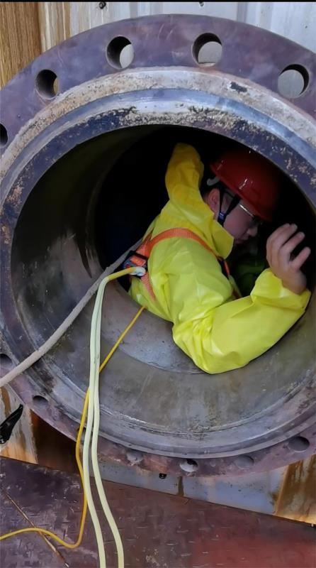 到达检验现场后,检验人员根据事先制定的检验方案,穿上防护服进入直径5米,高21米的大型蒸煮器内进行测厚和磁粉探伤。七月下旬的南宁室外环境温度三十七八度,容器内更是高达四十多度。检验人员挥汗如雨,在21米高的脚手架上爬上爬下一丝不苟地进行检验,完成了5台蒸煮器的检验工作。73台铸铁烘缸是美国进口的旧设备,检验人员逐台对这些设备进行了测厚和硬度检测。此次检验共发现安全隐患3处,检验人员针对检查中发现的问题,第一时间告知委托单位,并对73台铸铁烘缸的使用提出了合理化建议。经过整整三天的紧张工作,顺利完成了93台压力容器的检验,为压力容器的安全运行提供了保障。