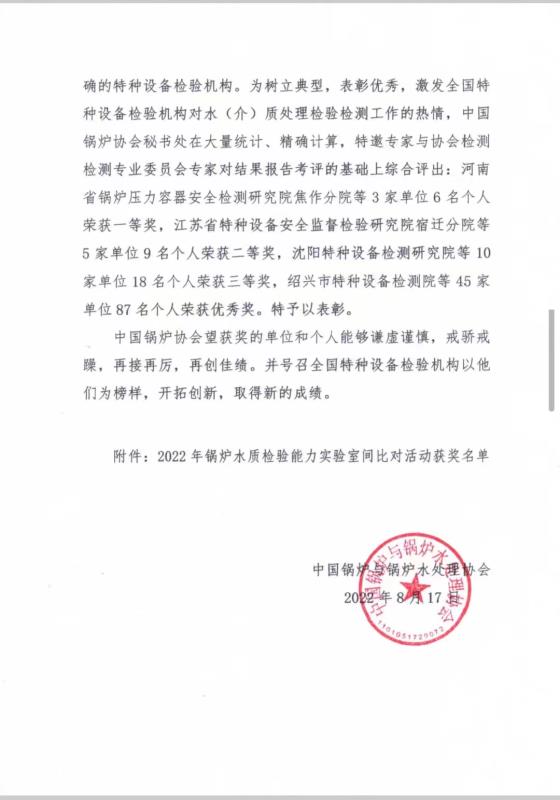 近日,在中国锅炉与水处理协会举办的锅炉水质检验能力实验室间比对活动中,我院参赛的两组比对人员从来自全国26个省、自治区、直辖市共88组检测比对试验结果中脱颖而出斩获佳绩,王亢亢、孔妍组荣获一等奖,贾红星、张全伟组荣获三等奖。