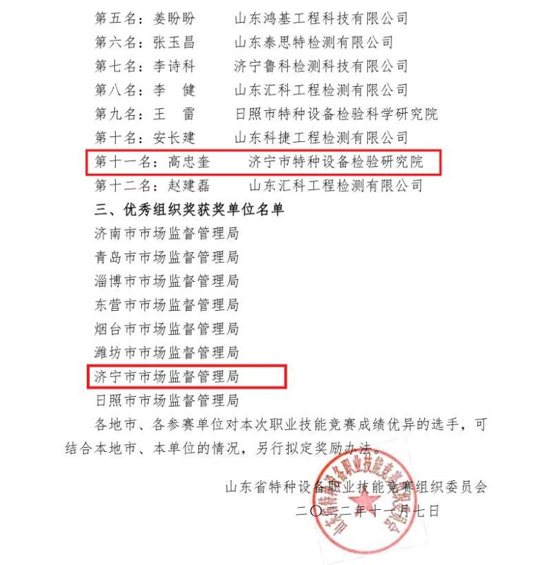 2022年11月3日到11月4日由山东省市场监督管理局、山东省人力资源和社会保障厅、共青团山东省委联合主办,山东省特种设备协会承办的山东省“技能兴鲁”职业技能大赛—2022年山东省特种设备检验检测(渗透检测)职业技能竞赛在山东济南举行,济宁市市场监管局选派济宁特检院三名参赛选手高忠奎、黄成浩、薛成骞,在副院长姚参军的带领下,参加了比赛。凭借扎实的理论知识、娴熟的检测技能,获得团体奖第三名的好成绩,在全省综合检验机构参赛队伍中排名第一,其中高忠奎荣获个人奖,薛成骞、黄成浩获“优秀选手”,济宁市市场监督管理局获“优秀组织奖”。