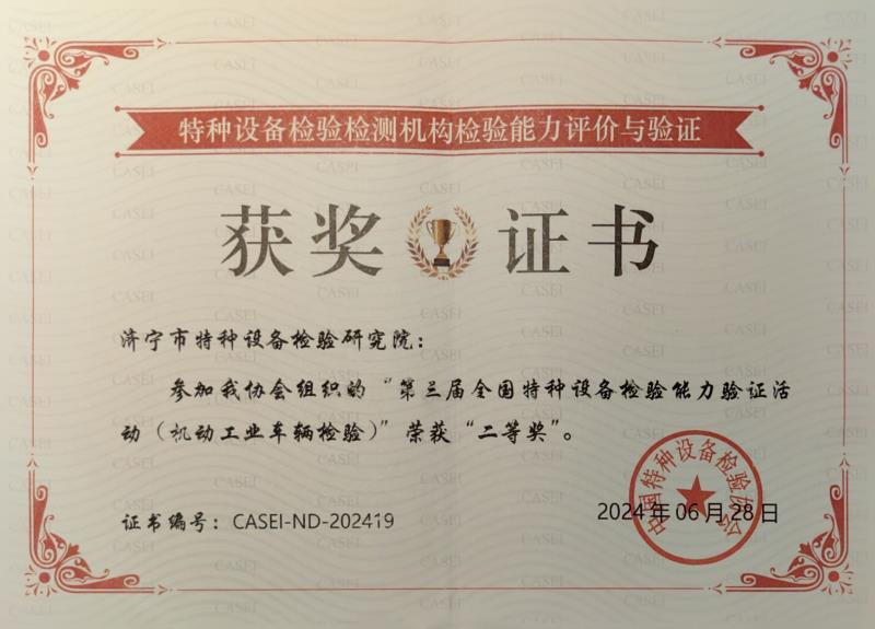 2024年6月25日至28日,全国第三届特种设备检验能力验证活动(场(厂)内专用机动车辆)在贵州省贵阳市举办,来自全国28个省份的141支队伍展开激烈精彩的角逐,最终我院在机动工业车辆检验项目中脱颖而出,荣获团体“二等奖”,并获得“满意”证书。