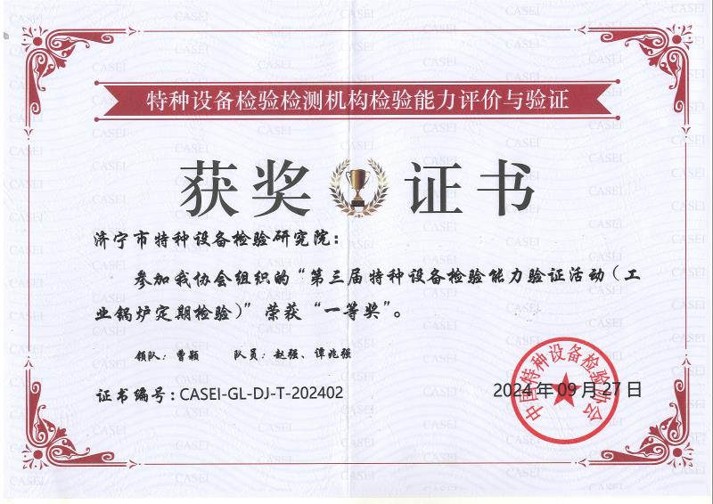 2024年9月24日至27日,中国特种设备检验协会组织的第三届全国工业锅炉检验能力比对活动在江苏省徐州市举办,共有来自全国30个省份的144支代表队、432名队员参赛。我院代表队经过层层角逐比拼,最终取得了工业锅炉定期检验综合排名第二名的优异成绩,荣获一等奖。