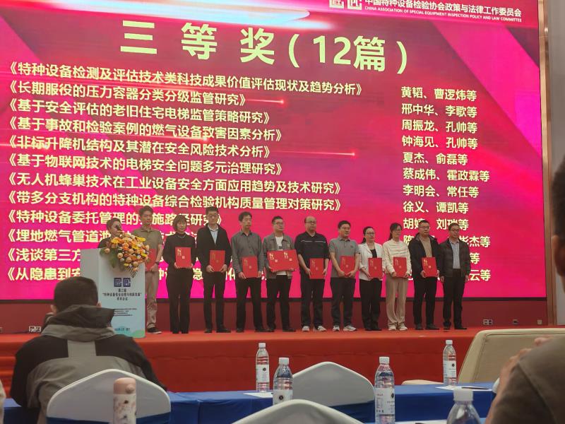 会议聚焦特种设备安全治理领域的热点问题,设置了主题报告、专题研讨和论文评选等多个环节。其中,论文评选活动备受瞩目,经过严格的初审、复审,最终69篇优秀论文进入现场答辩及专家评议环节,共评选一等奖3篇、二等奖6篇、三等奖12篇、优秀奖21篇。经过激烈角逐,我院选送的科技论文《浅谈电梯第三方检测机构的发展方向》获得三等奖,将被收录《特种设备安全治理与创新发展前瞻〔2024〕》一书,为广大特种设备安全工作者提供宝贵的学术参考资料。