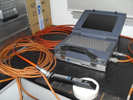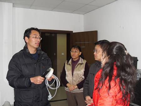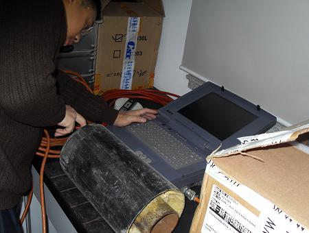 秦书记先向我们详细介绍了该院压力容器和管道近年来的检验情况,后安排专人带我们参观不拆保温检测方面的先进仪器设备。重点演示了荷兰RTD国际公司的不拆覆盖层脉冲涡流检测仪,该仪器是目前世界领先的仪器设备,其主要原理是由脉冲发射机发出一个快速变化的电磁场,诱发产生涡流,利用接收器检测涡流脉冲在金属器件中的衰变情况。把信号特征的瞬态响应时间和参考值比较来计算出金属物件的平均厚度。该仪器具有轻便、易操作、省时、高效、高精度等特点,其最大优点是不需拆除保温层,直接将探头放在保温层上进行检测。