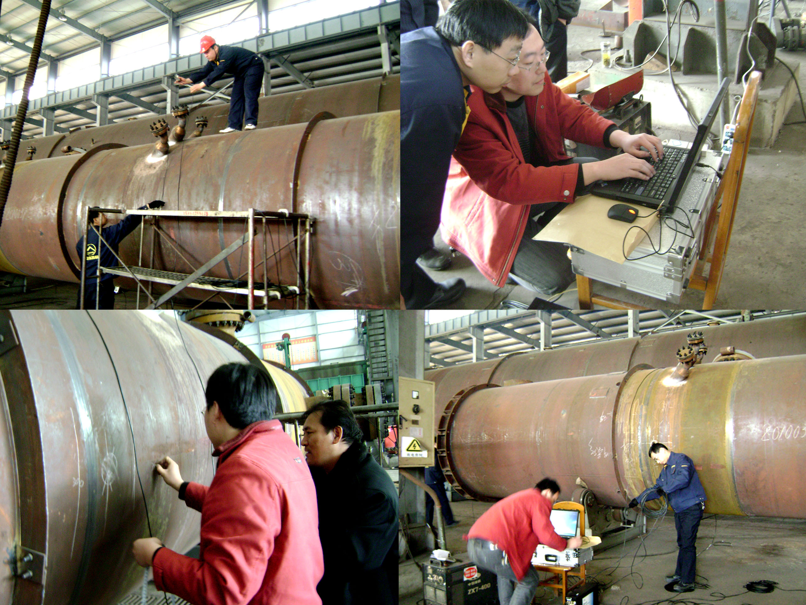 声发射检验现场 2011年3月9日,省特检院济宁分院容检中心在主任杨书宝的带领下来到兖矿化工机械厂,对一台旋风分离器进行声发射检验。