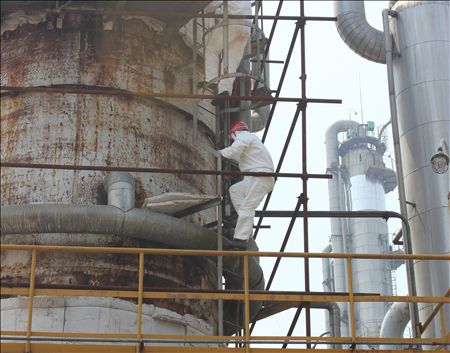 山东兖矿国际焦化有限公司是我市大型化工企业,其使用的压力容器近200台,大部分为高温高压,盛装易燃易爆介质的三类容器,而且塔类较多。因企业停产较久,现准备投产运行,运行前所有压力容器设备要进行全面检验,我院接到报检申请后,容管定检中心的同志们急企业所急,为企业所想,迅速做好了检验准备工作,只要一台设备准备出来具备检验条件了,一个电话,我们就派员及时去检验,从春节过后2月份开始到目前已检验完成了四分之三,我们有时放弃节假日进行检验,有时天气很热也要进罐检验,有时系安全带在二三十米高的地方高空作业,有时在作业环境很恶劣的情况下检验。