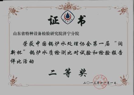 至11月2日,中国锅炉水处理协会在扬州隆重召开第一届“润新杯”锅炉水质检测比对试验和检验报告评比总结表彰大会,济宁分院荣获“二等奖”。