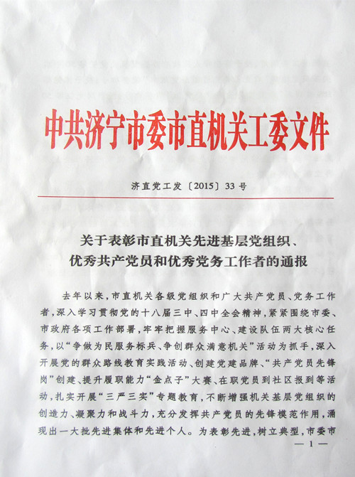 山东省特种设备检验研究院济宁分院党支部积极发挥基层党组织的创造力、凝聚力和战斗力,充分发挥共产党员的模范先锋作用,在服务中心、建设队伍,创建党建品牌等方面走在前列。于6月29日受到中共济宁市委市直机关工委表彰,被授予“市直机关先进基层党组织”荣誉称号。