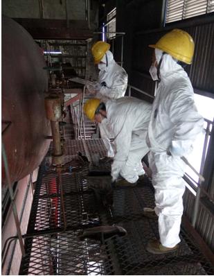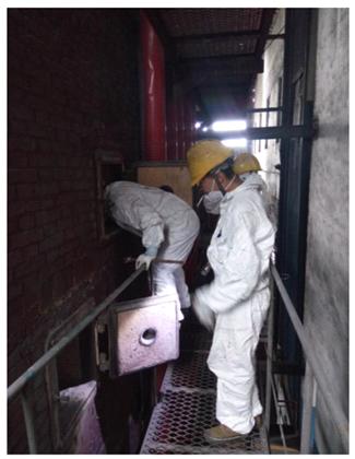 炉外部检验是对锅炉正常运行时的状况进行检验,锅炉内部检验是对停炉状态下锅炉内部状况的检验。炎炎夏日,七月入夏以来气温走高,室外温度30多度,密闭锅炉内部温度高达40度。锅炉房内一边是在运行的15吨循环流化床锅炉,炉温高达900度,热浪滚滚;另一边是高高矗立的35吨循环流化床锅炉,炉膛、尾部烟道空间密闭狭窄,遍布烟灰。