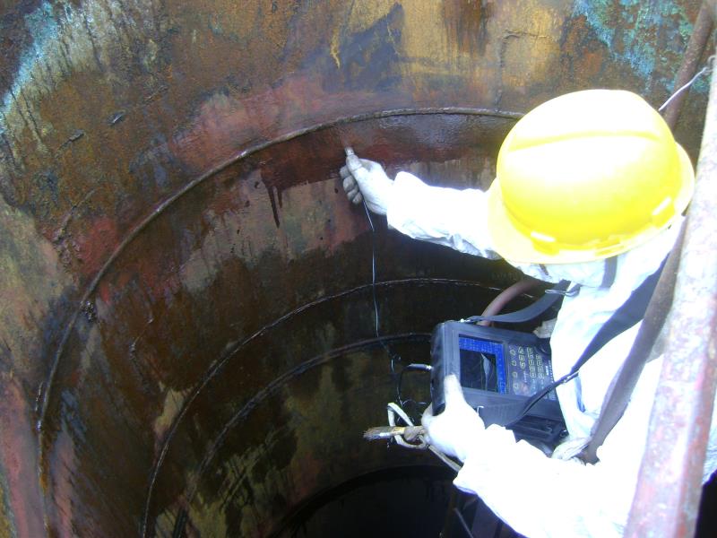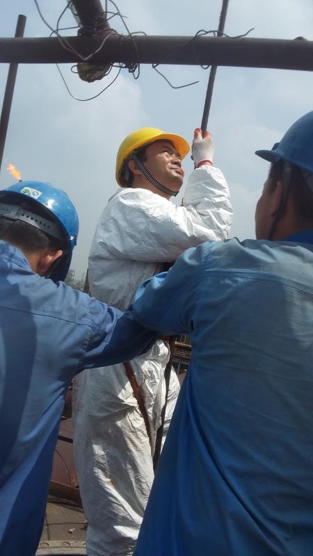 在高出地面近百米的某化工装置塔顶,临时搭起的简易升降台在风中左右摇曳,一位身着白色连体工装的年轻人腰捆着钢索,手端着数公斤重的检测设备,在摇晃之中顺着塔体内壁慢慢坠向塔底,漆黑的塔筒仿佛像一个无底深渊,微弱的安全顶灯里飘荡着浮尘,闷热的塔体内气味几乎令人窒息......