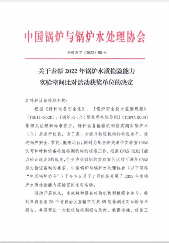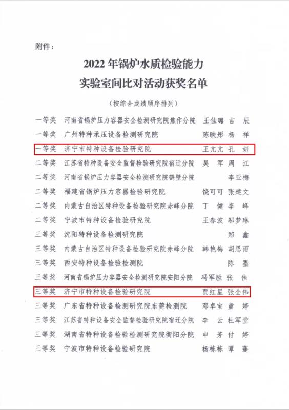 近日,在中国锅炉与水处理协会举办的锅炉水质检验能力实验室间比对活动中,我院参赛的两组比对人员从来自全国26个省、自治区、直辖市共88组检测比对试验结果中脱颖而出斩获佳绩,王亢亢、孔妍组荣获一等奖,贾红星、张全伟组荣获三等奖。