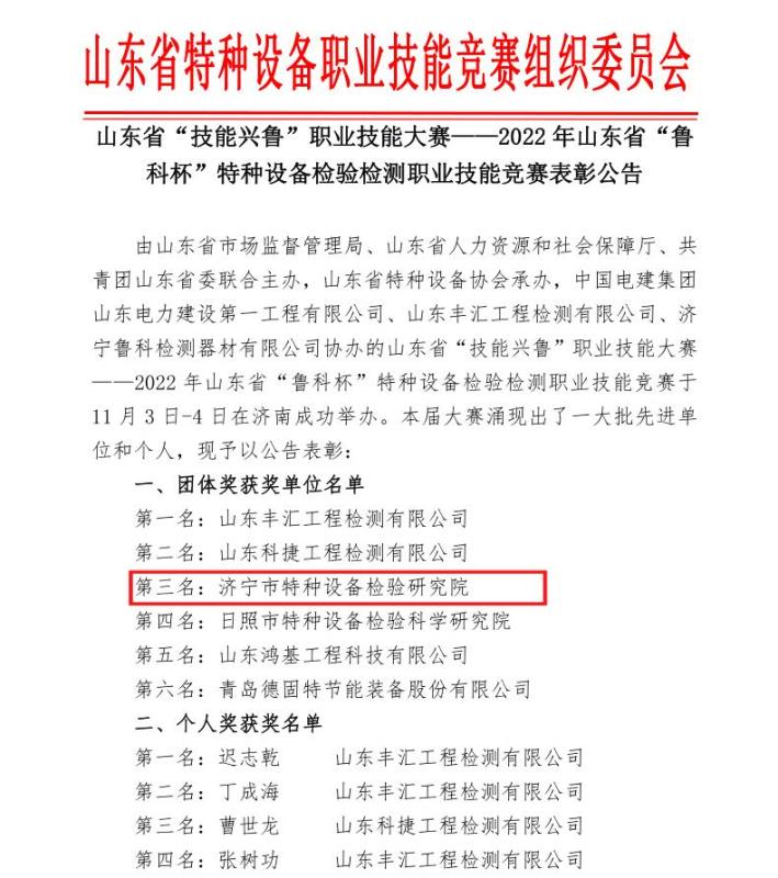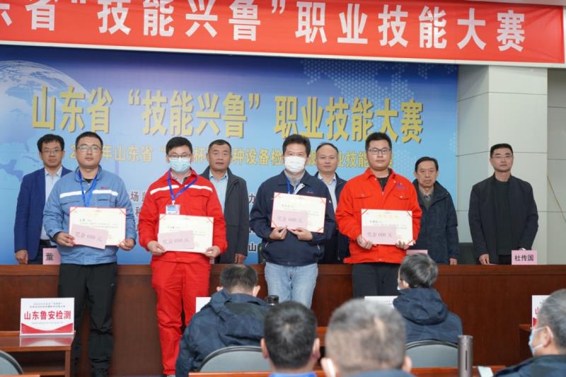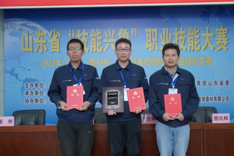 2022年11月3日到11月4日由山东省市场监督管理局、山东省人力资源和社会保障厅、共青团山东省委联合主办,山东省特种设备协会承办的山东省“技能兴鲁”职业技能大赛—2022年山东省特种设备检验检测(渗透检测)职业技能竞赛在山东济南举行,济宁市市场监管局选派济宁特检院三名参赛选手高忠奎、黄成浩、薛成骞,在副院长姚参军的带领下,参加了比赛。凭借扎实的理论知识、娴熟的检测技能,获得团体奖第三名的好成绩,在全省综合检验机构参赛队伍中排名第一,其中高忠奎荣获个人奖,薛成骞、黄成浩获“优秀选手”,济宁市市场监督管理局获“优秀组织奖”。