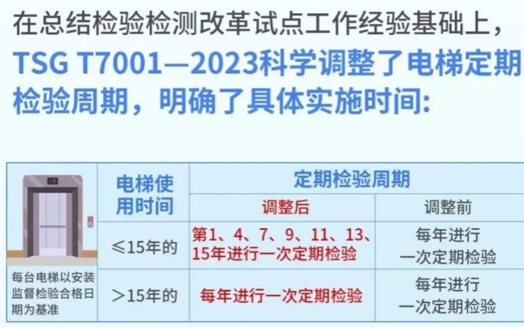 一、新检规“新”在科学调整了电梯定期检验周期。明确了具体实施时间,其他时间由使用单位落实安全主体责任,强化电梯自行检测。更好提升检验工作效能与服务质量。