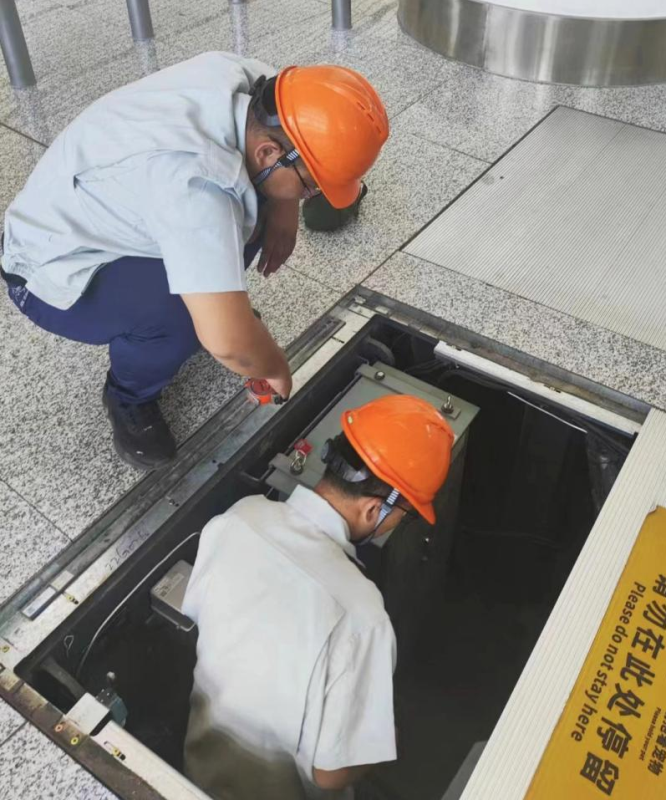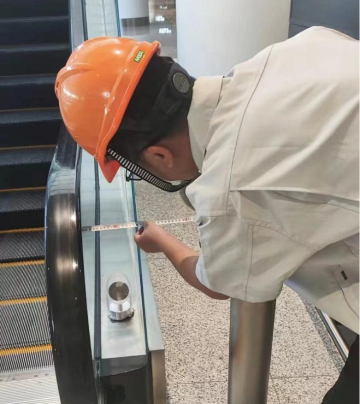 (现场检验) 大安机场作为济宁地区内唯一机场,2024年预计旅客吞吐量达到100万人次以上,作为人员密集场所,电梯的安全保障尤为重要。检验人员提前与机场沟通,制定专项检验计划,及时梳理检查资料清单,按照区域合理分配电梯检验台数,最大限度提高检验效率,避免检验工作干扰机场日常设备运行。在检验过程中针对关键项目进行重点检验,特别是在紧急停止装置、扶手装置、围裙板、梳齿与梳齿板、非操作逆转保护、梯级缺失保护等方面的安全功能进行重点检查。