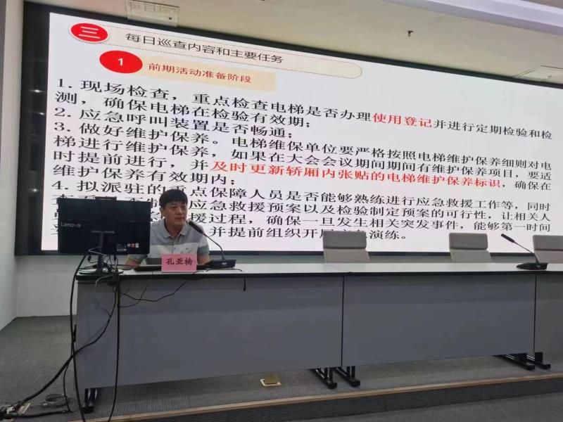 保障期间按照市专班要求对活动场所涉及的电梯开展了全覆盖安全检查,发现安全隐患20余处,对发现的安全隐患及时督促整改、安排并督导维保人员24小时驻点保障和电梯巡查等工作,确保电梯运行安全。论坛开始前,指导各使用单位和维保单位开展针对性的应急救援演练,并对使用单位电梯安全员和维保驻点人员开展了重大活动电梯安全保障工作培训。